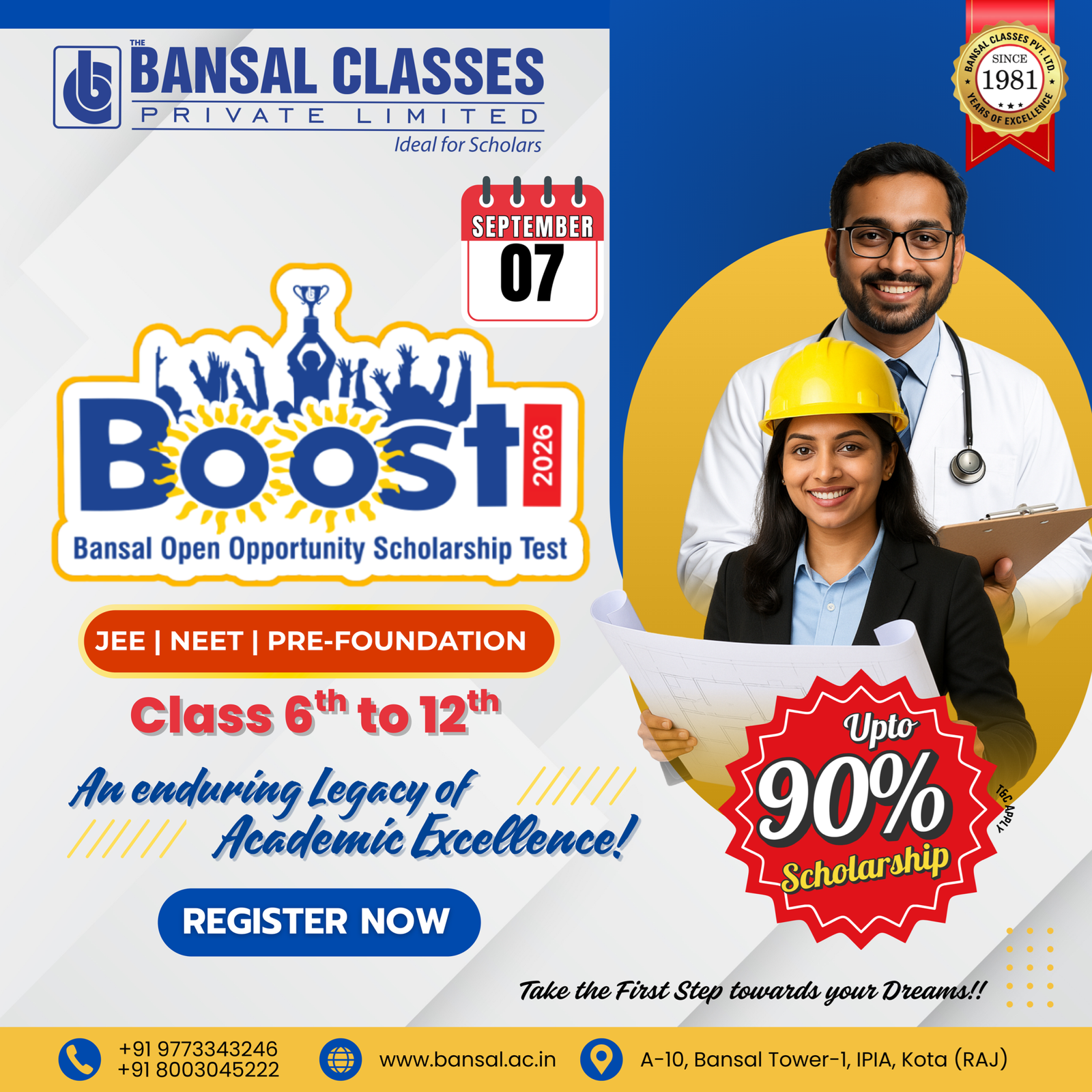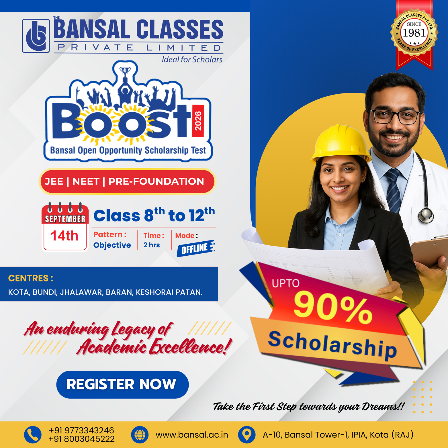 BOOST encourages academic excellence and provides unparalleled opportunities to students aspiring to succeed in competitive exams. It evaluates students’ academic potential and allows them to assess their performance at a national level. BOOST helps students prepare their minds for higher goals and empowers them to study with top-notch resources and guidance by offering substantial scholarships. Through this exam, Bansal Classes aims to inspire, nurture, and reward young talent, paving the way for a brighter future.
